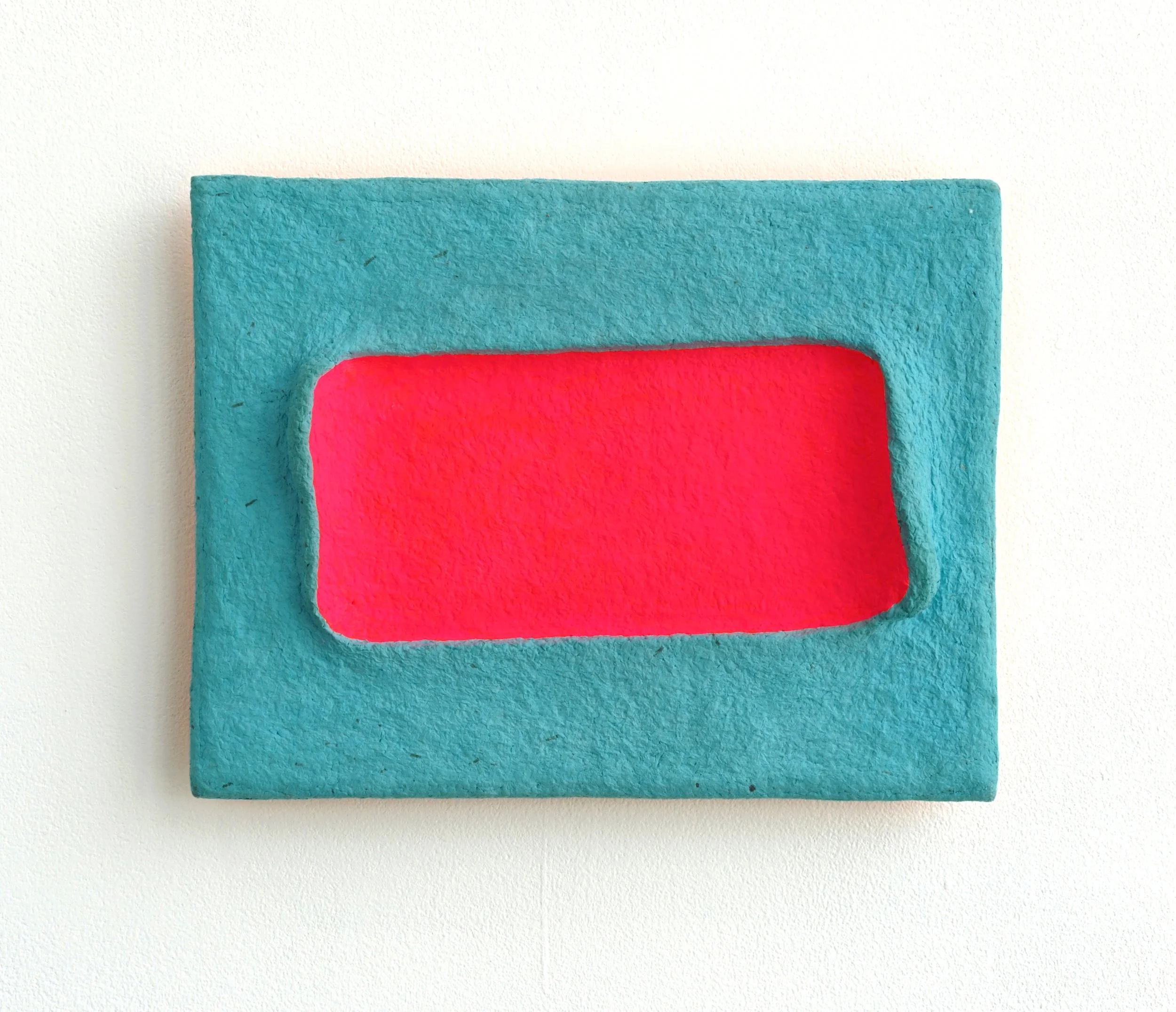 Three Flourescent Red Daubs in Viridian, 2021. Acrylic and Gouache on Paper Pulp, 12.5 x 16 x 1.5 inches. $3000